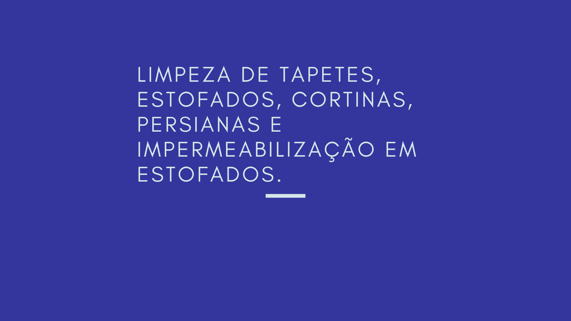 Trabalhamos com diversos tipos de estofados, como sofás, poltronas, cadeiras estofadas, almofadas, futons e puffs. Esse processo de limpeza pode ser a seco ou a água, com escovas específicas para cada tipo de estofado e equipamentos de tecnologia. Ideal para sujeira comum do estofado, eliminação de resíduos de alimentos, remoção de resíduos corporais, remoção de sujeira de obra, eliminação de odores, eliminação de resíduos de animais, remoção de manchas e marcas adquiridas durante tempo.